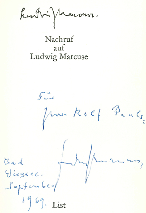 Marcuse, Ludwig, Nachruf auf Ludwig Marcuse. München, List 1969. 266, (6) S., OLwd. mit OUmschl. (dieser etw. unfrisch, Kopfschnitt minim. angestaubt). Vereinzelt Anstreichungen vermutlich des Bewidmeten. Insgesamt gutes Exemplar. EA. * Titelblatt mit einer eigenhänd. Widmung Marcuses, ich schon etwas wackeliger Schrift – Marcuse starb zwei Jahre Nach erscheinen seines „Nachrufs“.