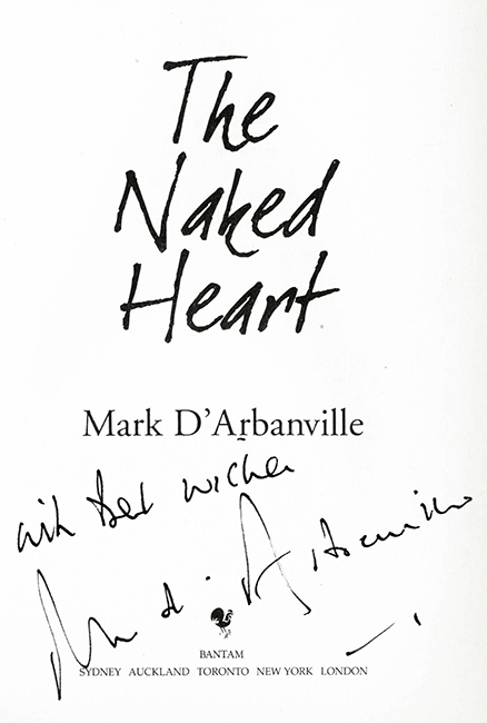 Arbanville, Mark D’, The Naked Heart. Sydney u.a., Bantam 2005. 289, 3) S., farb. illustr. OKt. Papier wie üblich etw. vergilbt, sonst gutes Exemplar. EA. * Titelblatt mit Grußwidmung „with the best wishes / Mark D’Arbanville“. – Der australische Autor wurde vorwiegend mit seinem Roman „The Naked Husband“ (″Der nackte Ehemann“) bekannt. Signierte Exemplare von D’Arbanville sind (obwohl es sich hier um ein „offiziell“ signiertes Buch handelt) selten.