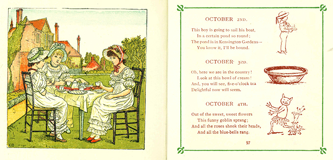 Greenaway – Kate Greenaway’s Birthday Book. Wirth verses by Sale Barker. London u. New York, Warne (um 1960). 10 x 10 cm. Ca. 260 S. (126 gezählte S. + ca. 134 nicht gezählte Seiten), illustr. OPp. Seite 2 mit Namenseintrag, 9 Bl. mit leichten Knitterspuren, sonst sehr gut erhalten. * Hübscher Kalender zum Eintragen von Geburtstagen oder anderen Terminen, ziegelrot u. grün gedruckt, mit 12 farbigen Monatsbildern u. Vignetten sowie Sprüchen zu jedem Tag des Jahres – der Band enthält auch einen 29. Februar, so dass auch Schaltjahre berücksichtigt sind. Zwischengeschaltet jeweils Blätter mit Leerzeilen für die Eintragungen.