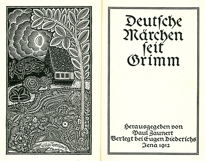 Deutsche Märchen seit Grimm. Hrsg. von Paul Zaunert. (= Die Märchen der Weltliteratur, hrsg. von Fr.v.d. Leyen u. Paul Zaunert). Jena, Diederichs 1912. 416 S. mit Frontispizillustrationen u. zahlr. Vignetten von H. F. Ernst Schneidler, OPp. mit farbig gemustertem Überzugspapier u. Ganzfarbschnitt (Rücken etw. verblasst u. mit kl. Druckstelle). Innendeckel mit einem schönen Exlibris. Insgesamt gutes Exemplar. 1. Auflage.