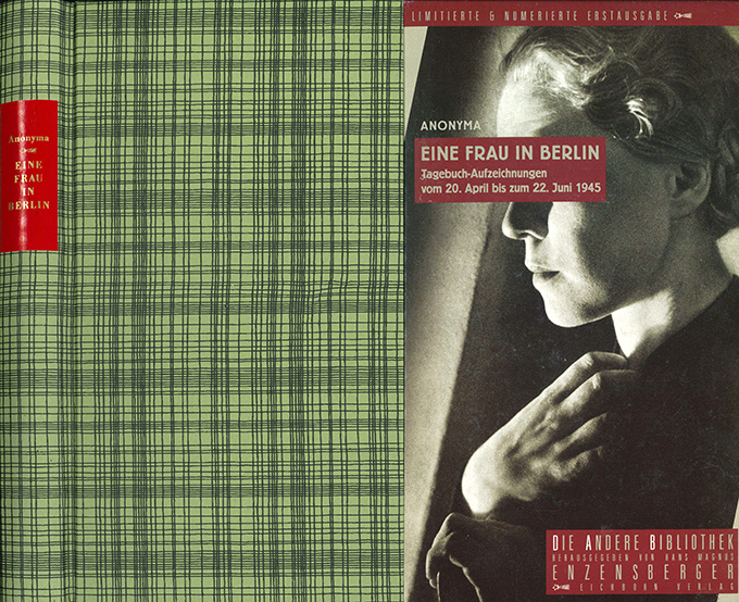 Andere Bibliothek – Anonyma, Eine Frau in Berlin. Tagebuchaufzeichnungen vom 20. April bis 22. Juni 1945. Nachwort von Kurt W. Marek. (= Die andere Bibliothek, hrsg. von Klaus Harpprecht u. Michael Naumann, Bd. 221). Frankfurt, Eichborn 2003. 293, (9) S., OPp. mit goldgepr. Rückenschild u. illustr. OKartonhülle. Tadelloses Exemplar. 1. Auflage innerhalb der AB. * Eins von 7000 nummer. Exemplaren. Aus der Korpus Garamond Antiqua gesetzt u. auf mattgeglättetes Bücherpapier gedruckt. Beiliegen 3 (davon 1 ganzseit.) Zeitungsrezensionen dieses Buches.