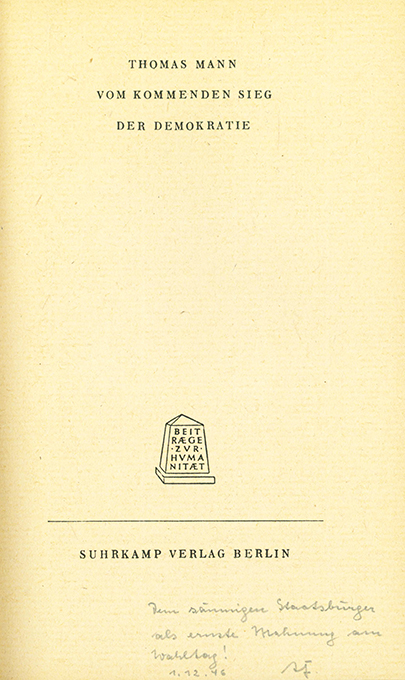 | Mann, Thomas, Vom kommenden Sieg der Demokratie. (= Beiträge zur Humanität). Berlin, Suhrkamp (1946). Kl.-8°. 40, (4) S., OBrosch. (gering nachgedunkelt, 2 kl. Randläsuren). Titelbl. mit einer heute noch gültigen Bleistiftwidmung „Dem säumigen Staatsbürger als ernste Mahnung am Wahltag!“ Insges. schönes Exemplar. EA WG² 97. Potempa G.662.4. Bürgin 53.a. * Die deutsche Originalform des Vortrags, den Thomas Mann 1938 in fünfzehn Städten Amerikas gehalten hat. Auf Maschinenbütten. Umschlagvariante ebenfalls Maschinenbütten statt grauem Karton u. etwas größer im Format als die übliche Auflage.