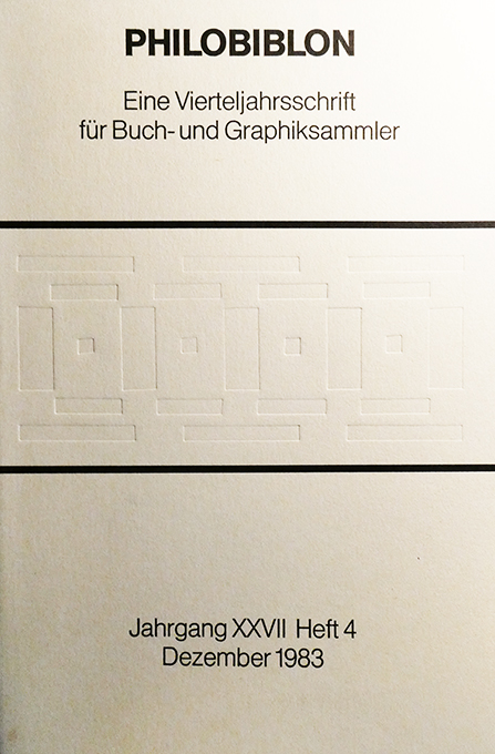 | Ringelnatz – Jensen, Jens Christian, Über den Maler und Zeichner Joachim Ringelnatz. S. 315 – 324 mit 4 Abbildungen auf Tafeln in: Philobiblon. Eine Vierteljahresschrift für Buch- und Graphiksammler. Heft 4/1983. Gr.-8°. (96 S.) mit Abbildungen, OKt. mit einer Blindprägung von Kurt Londenberg. Gutes Exemplar. * Weit. Beitr. von G.A. Kaldewey (Ernst Hauswedell in memoriam), W. Doede (Glanz und Elend der Fraktur), K. Londenberg (Nachtrag zu Ignatz Wiemeler) u.a.