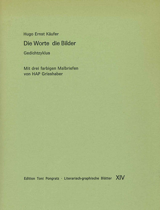 | Grieshaber – Käufer, Hugo Ernst, Die Worte die Bilder. Gedichtzyklus in memoriam Heinrich Böll, HAP Grieshaber. Mit 4 Abbildungen (davon 3 farb. Malbriefe) nach HAP Grieshaber. (= Literarisch-graphische Blätter XIV). Hauzenberg, Edition Toni Pongratz 1986. Gr.-8°. (20 S.), OBüttenkarton. Papieroberkanten u. der Umschlag stellenw. etw. nachgedunkelt, sonst tadelloses Exemplar. EA. * Eins von 250 handschr. numerierten Exemplaren, im Druckvermerk von Käufer signiert.