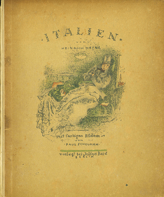 | Scheurich – Heine, Heinrich, Italien. Mit dreißig (davon 9 ganzseit.) kolorierten Zeichnungen von Paul Scheurich. Berlin, Bard (1919). (4), 148, (4) S., farb. illustr. OHlwd. (stark gebräunt, Fehlstelle am Kopfkapital, ein Gelenk stellenw. eingerissen). Innen bis auf wenige sehr zarte Fingerfl. gut erhalten. 1. Auflage. Schauer II.90 (mit Abb.)