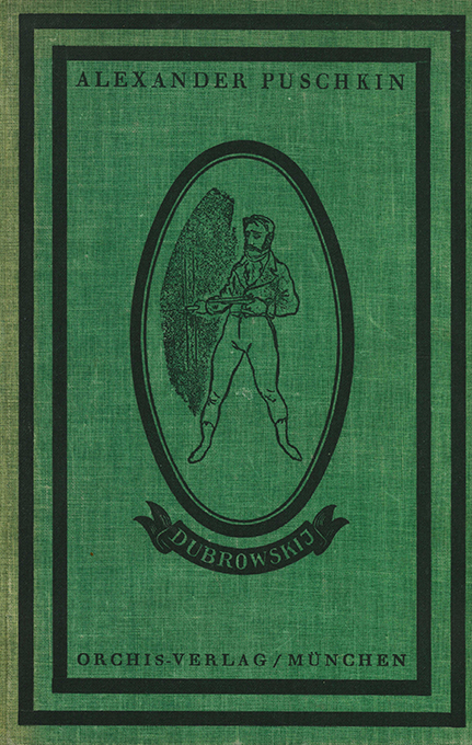 | Schlichter – Puschkin, Alexander, Dubrowskij. Übertr. von Alexander Eliasberg. Mit 16 ganzseit. Lithographien von Rudolf Schlichter. München, Orchis 1923. 86, (2) S. + 16 Graphikbl., dunkelgrüner illustr. OLwd. (Rücken u. stellenw. die Buchdeckel verblasst). Sonst gutes, innen tadelloses Exemplar. 1. Auflage.
