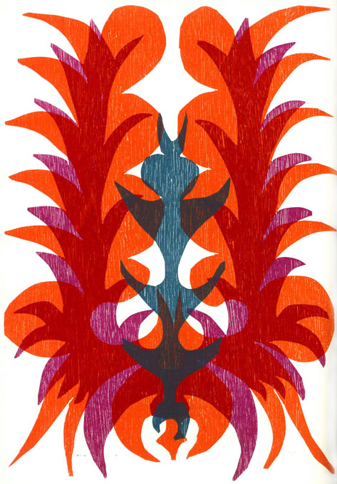 | Stiller – Freudenfeuerwerk. Manieristische Lyrik des 17. Jahrhunderts, ausgewählt und mit einem Nachwort versehen von Hubert Gersch. Mit 28 dreifarb. Orig.-Holzschnitten von Günter Stiller. Frankfurt, Bauersche Gießerei 1962. 24,5 x 32,5 cm. 49, (5) S., farb. illustr. OKart. (dieser wie meist etw. nachgedunkelt, Schnitt zart stockfl.) Ansonsten / innen gut erhalten. Tiessen 12. Spindler 51.21. * In recht kleiner Auflage für die Freunde des Hauses auf Bütten gedruckt. Die Typographie stammt ebenfalls von Stiller. Satz der Texte aus der Vendôme-Antiqua u. -Kursiv. – BEILAGE: Kleiner Orig.-Holzschnitt (Mann flieht krabbelnd vor einem ihn verfolgenden Riesendolch; Stockgr. ca. 17,5 x 8,5 cm, Blattgr. 26 x 11,5 cm; ein kl. Fleck im weißen Rand), wohl ein Handabzug des Künstlers, von Stiller signiert u. datiert.