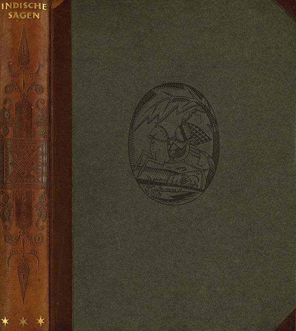| Schneidler – Indische Sagen. Übersetzt von Adolf Holtzmann. Neuherausgabe mit Vorwort von M. Winternitz. Buchausstattung von Ernst Schneidler. Jena, Diederichs 1921. 3.-5. Tsd. Gr.-8°. XXX, (2), 318, (2) S., zweifarb. gemusterte Vorsätze, illustr. OHalblederbd. mit Lederecken, gold- u. blindgeprägtem Rücken u. Kopfgoldschnitt (Kopfkapital mit einer 8 x 12 mm großen Läsur, eine Ecke etw. berieben). Sonst sehr schönes Exemplar. * Einbandgestaltung, illustr. Doppeltitel u. 13 illustrierte Zwischentitelblätter, jeweils zweifarbig gedruckt, sowie 14 Vignetten von Ernst Schneidler.