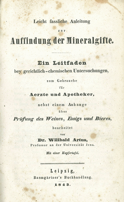 Toxikologie – Artus, Wilibald, Leicht fassliche Anleitung zur Auffindung der Mineralgifte. Ein Leitfaden bey gerichtlich-chemischen Untersuchungen, zum Gebrauche für Ärzte und Apotheker, nebst einem Anhange über Prüfung des Weines, Essigs und Bieres. Leipzig, Baumgärtner 1843. XII, 247 S. mit einer beiliegenden gefalt. Kupfertafel (diese mit Fehlstelle am Rand ohne Bildverlust), Pappbd. der Zeit (diverse Altspuren). Papier teils stockfl.; insges. wohlerhalten. Selten. EA.