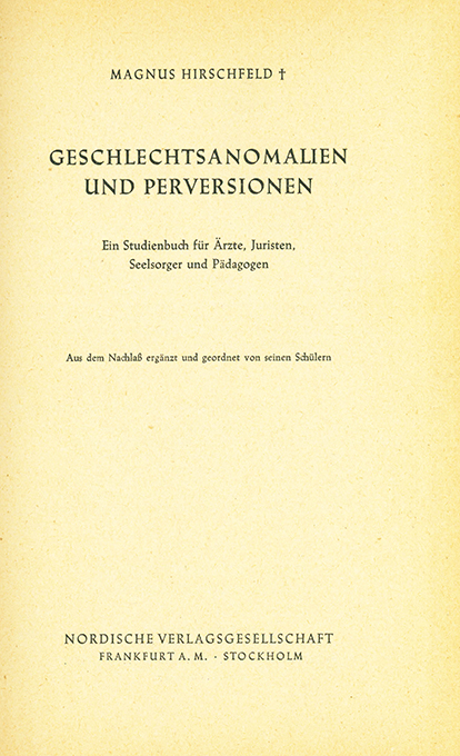 | Hirschfeld, Magnus, Geschlechtsanomalien und Perversionen. Ein Studienbuch für Ärzte, Juristen, Seelsorger und Pädagogen. Aus dem Nachlaß ergänzt und geordnet von seinen Schülern. Frankfurt u. Stockholm, Nordische Verlagsges. (ca. 1950). 635 S., OLwd. mit goldgepr. Rückentitel. Papier materialbedingt stellenw. nachgedunkelt, Schnitt angestaubt; insges. gutes Exemplar. EA in Deutschland. * Das Werk mußte, da das Manuskript verbrannt war, von der engl. und franz. Ausgabe ins Deutsche rückübersetzt werden.