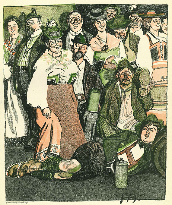 | Rideamus (d.i. Fritz Oliven), Berliner Bälle. Mit Bildern von Ernst Heilemann. Berlin, „Harmonie“ (um 1906). 30. Tsd. Gr.-4°. (40 S.) Text, 5 Kartonbl. mit ganzseit. Farblithographien, farb. illustr. OLwd. mit mont. Deckelillustration (Exemplar insges. gewölbt, Einband u. Vorsätze mit Wasserrändern, Vorsätze knitterspurig). Innen weitgehend gut erhalten, auch der illustr. Vorderdeckel in akzeptablem Zustand.