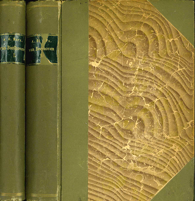 Beethoven – Marx, Adolph Bernhard, Ludwig van Beethoven. Leben und Schaffen. In zwei Theilen mit chronologischem Verzeichnis der Werke und autographischen Beilagen. Fünfte Auflage, mit Berücksichtigung der neuesten Forschungen durchgesehen u. vermehrt von Gustav Behncke. Zwei Bände. Berlin, Janke 1901. Gr.-8°. XXVII, 399 u. VIII, 562 S. mit zahlr. Notenbeispielen, 7 (teils mehrseit., teils gefalt.) Faksimile-Beilagen, Halbleinenbde. der Zeit mit goldgepr. Rsch. (eines davon mit Fehlstelle). Nur minim. Gbrsp., gut erhalten.