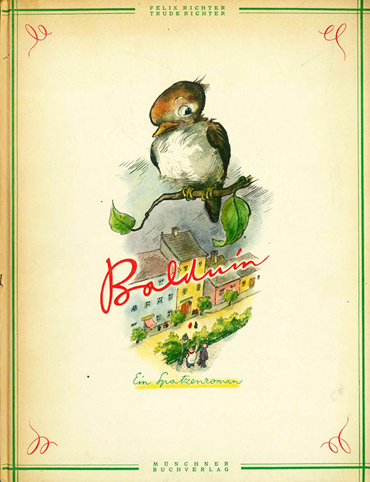 | Richter, Tr. – Richter, Felix, Balduin, ein Spatzenroman [in Versen]. Bebildert von Trude Richter. München, Münchner Buchverlag 1942. 4°. 64 S. mit zahlr. farb. Illustrationen, farb. illustr. OPp. (dieser wie üblich stellenw. gebräunt, Kopfkapital etw. bestoßen, Vordergelenk mit einer kleinen Läsur). Papier wie immer minim. vergilbt. Insges. wohlerhaltenes, innen sehr gutes Exemplar des fragilen und witzig illustrierten Bandes. EA.