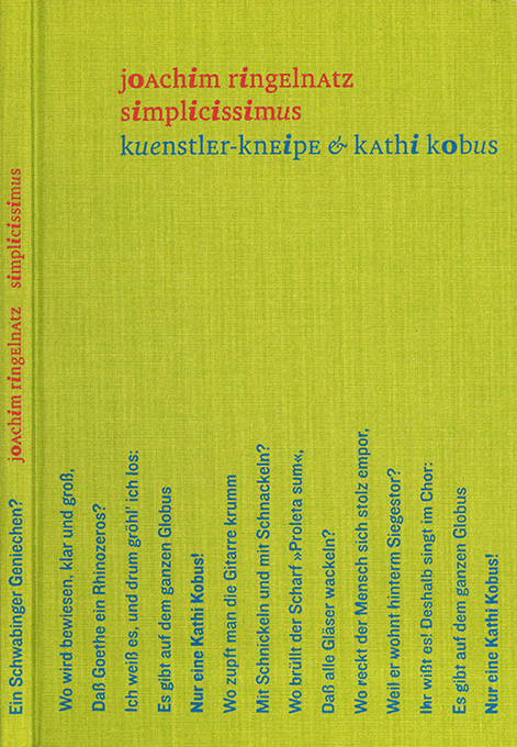 Ringelnatz, Joachim, Simplicissimus. Kuenstler-Kneipe & Kathi Kobus. (Erstfassung von 1909). Mit 2 zweifarb. Orig.-Lithographien u. 8 ganzseit. farb. Illustrationen von Florian Mitgutsch. (= Graphische Bücher. Erstlingswerke deutscher Autoren, Bd. 32). Leipzig, Faber & Faber 2007. 4°. 77, (3) S. mit Photographien, OLwd. Tadelloses Exemplar. 1. Auflage. * Eins von 999 numer. Exemplaren, vom Künstler signiert. Gesamtgestaltung von Rainer Groothuis. Die Texte wurden aus der TC Charter u. der HTF Knockout gesetzt u. in Lindgrün u. Schwarz im Buchdruckverfahren gedruckt.