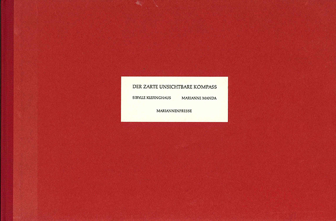 | Mariannenpresse – Klefinghaus, Sibylle, Der zarte unsichtbare Kompaß. Mit 6 Orig.-Radierungen von Marianne Manda. Berlin 1991. 39,5 x 26,3 cm (quer). (48 S.), OHlwd. (stellenw. minim. verblasst). Titelbl. an der Außenkante mit einigen kl. Farbfleckchen, Schnitt u. einige Bl. mit hellbraunem Fleck im weißen Randbereich. Sonst gut erhalten. EA. * 56. Druck der Mariannenpresse. Eins von 100 nummer. Exemplaren, von Autorin u. Künstlerin signiert. Die Gedichte wurden aus der Palatino gesetzt u. auf kräftigen Hahnemühle-Kupferdruckbüttenkarton gedruckt.
