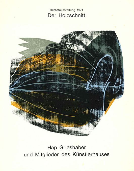| Grieshaber – Der Holzschnitt. Hap Grieshaber und Mitglieder des Künstlerhauses. Herbstausstellung. Wien, Künstlerhaus 1971. 4°. (36 S.) mit ganzseit. SW-Abbildungen, (16 S.) Beilage mit ganzseit. schwarzweißen, ein- u. zweifarbigen Holzschnittabbildungen von Grieshaber, farb. illustr. OBrosch. (diese u. die Beilage stellenw. gering vergilbt). Sonst sehr gut erhalten, selten.