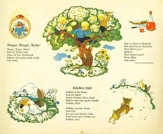 Wenz-Viëtor – Diek, Charles (Hg.), Schweinchen schlachten, Würstchen machen, quiek, quiek, quiek. Lustige Kleinkinderreime für Mutter und Kind. Mit Bildern von Else Wenz-Viëtor. (= [Stalling Bilderbuch, ehem. Nürnberger Bilderbücher] Nr. 19). Oldenburg, Stalling 1941. 35.-54. Tsd. 27,8 x 22,5 cm (quer). (16 S.) mit sehr zahlr. farbigen Illustrationen (Offset-Lithos), farb. illustr. OHlwd. (etwas berieben u. bestoßen, eine Ecke mit größerer Läsur). Insgesamt div. leichte Gbrsp., jedoch gut erhaltenes Exemplar. Liebert (Schiefertafel 2/1984) 19. Stuck-Villa II 354 (diese Aufl.) Bilderwelt 638. * In diesem Bilderbuch sind außer dem titelgebenden Vers nahezu alle Kindergedichte auch für Vegetarier bestenes geeignet. Das Buch ist entzückend illustriert und war einer der größten Erfolge unter den Stalling-Bilderbüchern.