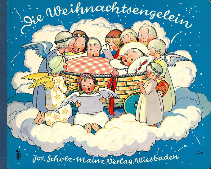 Wenz-Viëtor- Die Weihnachtsengelein. [Text von Hans Probst, Bilder von Else Wenz-Viëtor]. Wiesbaden, Scholz (ca. 1955; 2. Aufl.) 27 x 21,5 cm (quer). 10 Kartonbl. mit jeweils einer ganzseit. farbigen u. einer ganzseit. SW-Illustration sowie jeweils einem ausgestanzten Engelsköpfchen, farb. illustr. OHlwd. Einige der (meist deutlich stärker beschädigten) Engelsköpfchen mit leichten Knickspuren, sonst sehr gut erhaltenes, vollständiges Exemplar. Vgl. Bilderwelt 1160 (dort die EA von 1933). * „Nach dem Muster der Zehn kleinen Negerlein helfen hier die Engel ein Kindlein zu versorgen und den Weihnachtsbaum anzuzünden, bis schließlich alle zehn singen: Stille Nacht, Heilige Nacht.“ (Bilderwelt S. 391)