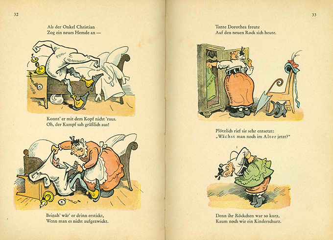 | Buschiade – Herbert, Wilhelm (d.i. Wilhelm Mayer), Maus und Molli. Eine Mädelgeschichte nach Wilhelm Busch in sieben Streichen. Bilder von Karl Storch. München, Braun und Schneider 1957. Titelbl., 54 S. mit zahlr. farb. Illustrationen, farb. illustr. OHlwd. (minim. berieben, Vorsätze gering angestaubt). Papier nur sehr vereinzelt leicht stockfl. Insges. wohlerhaltenes Exemplar. Vgl. Seebaß II.790 (3. Aufl.) Eymer (Pseudonymen Lexikon) S. 224. * „Ins Derbere gezogene Buschimitation ″ (Seebaß II, S. 139), folgend „Max und Moritz“. – Neudruck der Ausgabe von ca. 1905, hier noch mit der schönen, alten Einbandillustration.