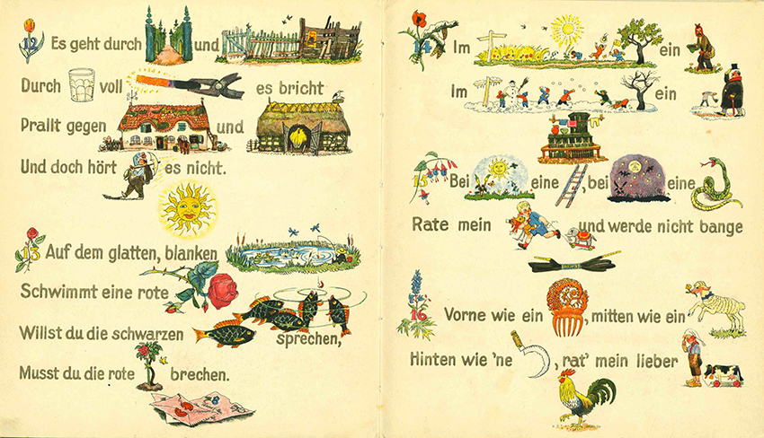 | Nürnberger Bilderbücher – Hobrecker, Karl (Hg.), Wer will mit frischen Backen diese schönen Nüsse knacken? Ein Bilderbuch mit alten Kinderrätseln. Bilder von Helmut Skarbina. (= Nürnberger Bilderbücher Nr. 54). Oldenburg, Stalling 1926. 21 x 24 cm. (16 S.) mit sehr zahlr. kleinen farbigen Illustrationen, illustr. Vorsätze, farb. illustr. OHlwd. (Kanten berieben, Ecken bestoßen). Innenteil mit einigen sehr geringen Knitterspuren. Insges. gutes u. sauberes Exemplar. EA. Liebert (Schiefertafel) 54. Bilderwelt 632. Sebaß II.835.
