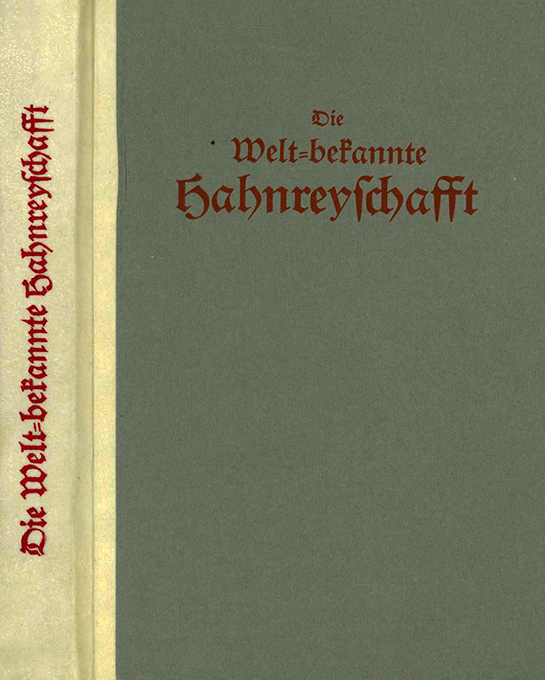 | Würth, Handpresse – Die Welt-bekannte, Doch Nicht von jedermann Recht-erkannte Hahnreyschafft. Nach ihrer eigentlichen Natur, Ursprung und Würckungen samt den sogenannten Hahnreyen und Hahnreyinnen und deren Mannigfaltigkeit; Wie nicht weniger Dienlicher Unterricht. Wie sich vor solcher beschwerlichen Bürde zu hüten und wie man derselben auf gewisse Masse wieder loß werden könne; Wobei auch allenfalls Ein besonderer Trost Für alle diejenige, welche ihr verdrießliche Ordens-Zeichen und hartes Joch fernerweit zu tragen haben. Alles aufrichtig vorgestellt Durch Eine neutrale Feder. Darmstadt, Darmstädter Verlag 1931. (6), 207, (3) S., OHalbpergamentbd. Das erste u. letzte Leerbl. wie üblich materialbedingt etw. nachgedunkelt, sonst tadellos. * Eins von 250 handschr. nummer Exemplaren. Gesetzt u. gedruckt auf der Hand-Presse von Joseph Würth auf Bütten, einige Bl. in Rot u. Schwarz. – „Höchst curioses Buch, voll derb-pikanter Satyre u. bitterer Ironie, gespickt mit erotischen Historien.“ (Hayn-Gotendorff III.11 zur Erstausgabe von 1733).