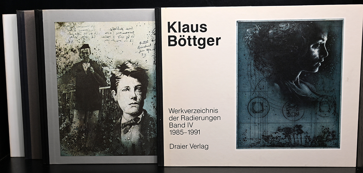 Böttger – Klaus Böttger. Werkverzeichnis der Radierungen. 1964 – 1991. Werkverzeichnis der Lithographien 1967 – 1984. Vier Bände. Frankfurt u. Friedberg, Draier u. Wiesbaden, Nassauischer Kunstverein (ca. 1976) – 1994. 29 x 24 cm (quer). Zus. 462 S. mit zahlr. (teils farbigen) Abbildungen, unbedruckte OBrosch. (Bd. I, gering nachgedunkelt, eine Knickspur), unbedruckter OHlwd. (Bd. II, Rücken minim. verblasst), farb. illustr. OHalbleinenbde. (Bde. III u. IV). Gut erhaltene, vollständige Reihe. EA. * Bd. II: Eins von 1000 Ex. der Vorzugsausgabe B mit beiliegender Orig.-Radierung „Mädchen X“ (Plattengr. 12,5 x 16,2 cm, Blattgr. 22 x 28,5 cm), auf Bütten gedruckt, nummeriert u. signiert (Werkverz. 472). Bd. IV: Eins von 350 Ex. der Vorzugsausgabe mit beilieg. zweifarb. Orig.-Radierung „Halbakt“ (Ausschnitt; Plattengr. 14 x 18,3 cm, Blattgr. 22,5 x 28,5 cm), auf Bütten gedruckt, nummeriert, verso mit Nachlassstempel versehen u. mit Nachlasssignatur von Ursula Böttger (Werkverz. 545). – Dieses vollständige Werkverzeichnis umfasst 604 Radierungen u. 26 Lithographien, sämtlich abgebildet.