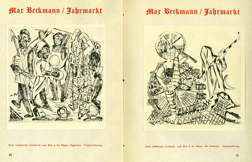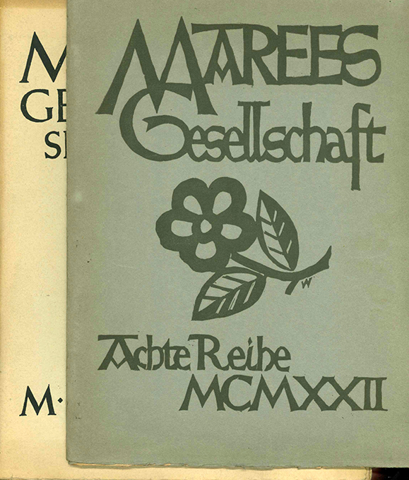 | Marées Gesellschaft. Siebente UND Achte Reihe der Drucke. Hrsg. von J. Meier-Graefe. Mit Holzschnittvignetten u. -schmuckinitialen, einem Titelblatt u. einem Einbandholzschnitt von E.R. Weiß. Zwei Bände. München 1921 u. 1922. Gr.-4°. (12 ) u. 18, (2) S. mit 6 (davon 4 farb.) mont. Farbabbildungen, OBüttenumschläge (einer minimal, der andere stärker an den Rändern nachgedunkelt). Sonst sehr gute u. frische Exemplare. * Bibliophile, in kleiner Auflage in Rot u. Schwarz in Bleisatz auf schweres, handgeschöpftes Bütten gedruckte Verlagsprospekte. Angekündigt werden die Drucke 32 – 36: Chinesische Farbenddrucke; Cezanne und seine Ahnen; Canticum Canticorum (Holzschnittbuch des 15. Jh.); Edouard Manet-Mappe; Max Beckmann, Jahrmarkt (mit 2 Lichtdrucken nach Radierungen). – Beiliegt ein 8seit. Verlagsprospekt, ein Bestellblatt u. ein Rücksendekuvert.