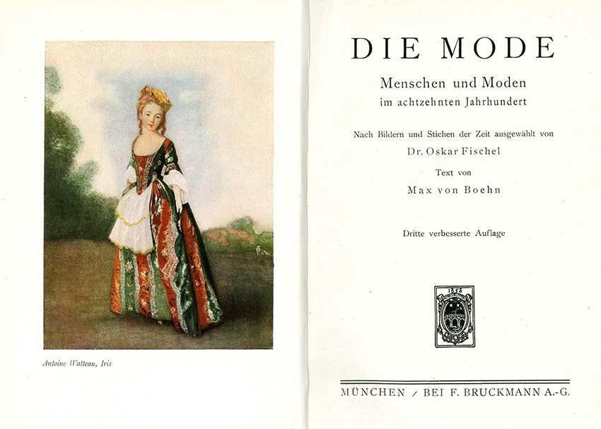 | Mode – Boehn, Max von u. Oskar Fischel Die Mode. (Acht Bände). Nach Bildern und Kunstwerken der Zeit ausgewählt und geschildert. München, Bruckmann 1923 – 1928. Zus. 1888 S. auf Kunstdruckpapier, mit sehr zahlr. Abbildungen + 239 Farbtafeln, blaue OSeidenbde. mit goldgepr. Deckelvignetten u. hübschen goldgepr. Rücken (Einbände stellenw. minimal nachgedunkelt, was an den Rücken zwischen dem prunkvollen Gold praktisch nicht auffällt, wenige winzige Läsuren). 9 Bl. leicht angerändert. Insges. sehr gut erhaltene Ausgabe in dekorativen, einheitlichen Einbänden. Zwei Bde. liegen in EA vor, die übrigen in verschiedenen, teils verbesserten Auflagen. * Standardwerk zur Kostümgeschichte. I: Menschen und Moden im Mittelalter. Vom Untergang der alten Welt bis zur Renaissance. II: Menschen und Moden im sechzehnten Jahrhundert. III: Menschen und Moden im siebzehnten Jahrhundert. IV: Menschen und Moden im achtzehnten Jahrhundert. V – VIII: Menschen und Moden im neunzehnten Jahrhundert (1790 – 1817 / Empire; 1818 – 1842 / Biedermeier; 1843 – 1878; 1879 – 1914). – „Die stärkste, bis heute anhaltende Wirkung erzielte Boehn mit seiner Modegeschichte, die zwischen 1907 und 1925 in acht Bänden erschien. Naturgemäß richtet sich Boehns Blick fast ausschließlich auf herrschende Schichten. Er bettet seine Darstellung jedoch in die jeweiligen politökonomischen Zusammenhänge ein, die an kritischer Sicht wenig zu wünschen übrig lassen, also auch Boehns eigene Klasse nicht schonen. Sein Stil ist knapp, treffend, bissig und nicht ohne Sinn für Komik.“ (Wikipedia)