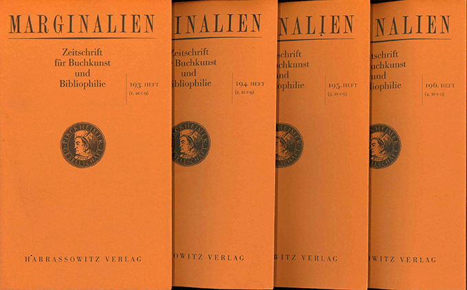 | Marginalien. Hefte 1 – 4 / 2009 (Nrn. 193 – 196, davon 3 Vorzugsausgaben). Zeitschrift für Buchkunst und Bibliophilie. Hrsg. von der Pirckheimer-Gesellschaft. Wiesbaden, Harrassowitz 2009. Gr.-8°. Zus. 460 S. mit Abbildungen + 32 S. typograph. Beilagen (Buchdruck auf Maschinenbütten), OBroschuren mit OUmschlägen. Tadellos. * Mit 3 Graphikbeilagen: Eduard Prüssen, Orig.-Linolschnitt. – Wassilij Masjutin, Orig.-Holzschnitt (vom erhaltenen Stock) „Trinkgenossen“. – Eva Natus-Salamoun, Orig.-Farblithographie „Kein Ende der Geschichte…“. Die Graphiken von Prüssen u. Natus-Salamoun signiert, Masjutin war leider längst verstorben. Zu Heft 193 gab es keine Vorzugsausgabe. – Aus dem Inhalt: Wilhelm M. Busch; Hugo Steiner-Prag; 50 Jahre Domowina-Verlag; Später Dank an Grieshaber; Briefwechsel Günter Kunert u. Paul Schuster (8 S. typograph. Beilage); Eduard Prüssen; Josef Weisz zum 40. Todestag; Max Schwimmer; Egbert u. Renate Herfurth; Anna Seghers u. ihr Bilddenken; Wassilij Masjutin; Das Auge des Sammlers sieht man leuchten. Das Antiquariat im Gedicht (8 S. typograph. Beilage; Texte von A.R. Meyer, E. Roth u.a.); Baldwin Zettls Kupferstiche zu Goethes „Faust“; Mynona, „Wie ich den Nazis entging, ist mir ein Rätsel.“ Briefe aus den späten Jahren des Exils (8 S. typograph. Beilage).