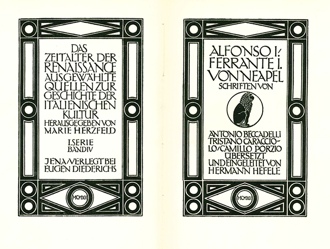 Neapel – Beccadelli, Antonio, Tristano Caracciolo u. Camillo Porzio, Alfonso I. / Ferrante I. von Neapel. Schriften. Übertr. u. eingeleitet von Hermann Hefele. (= Das Zeitalter der Renaissance. Ausgewählte Quellen zur Geschichte der italienischen Kultur, I. Serie, Bd. IV). Jena, Diederichs 1912. LXV, 321, (3) S. + 12 (1 doppelseit.) Tafeln, späterer Halbleinenbd. mit farb. Modeldruck-Überzugspapier u. goldgepr. Lederrückenschild. Rücken minim. verblasst, sonst sehr gutes Exemplar im individuellen Handeinband. DEA.