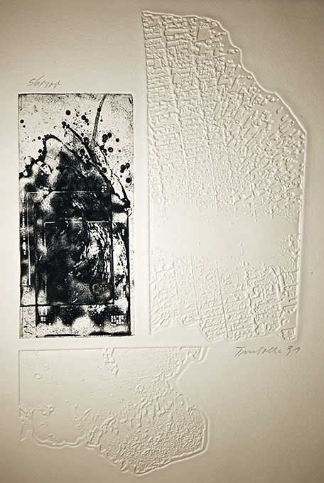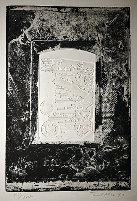 | Sisyphos-Presse – Hein, Christoph, Die Vergewaltigung. Nachwort von Elmar Faber. Mit 6 Origiginalradierungen von Dieter Tucholke. Berlin, Faber & Faber 1991. 32,5 x 40,5 cm. 28, (4) S. + 6 Graphikbl., OHalbpergamentbd. mit blindgepr. Deckelillustration, in dünnem Kartonschuber (dieser mit einem Randeinriss). Das Buch ansich tadellos erhalten. EA. * 5. Druck der Sisyphos-Presse. Eins von 300 handschr. nummer. Exemplaren. – Die Radierungen – sämtlich in Kombination mit Reliefprägungungen – wurden auf kräftigen, handgeschöpften Büttenkarton gedruckt, sämtlich nummeriert, signiert u. datiert. – Christoph Heins Text wurde aus der Walbaum-Antiqua von Hand gesetzt u. auf hellgraues Popset-Papier von Arjomari, Paris, gedruckt. Handeinband von der Buchbinderei Markus Rottmann.