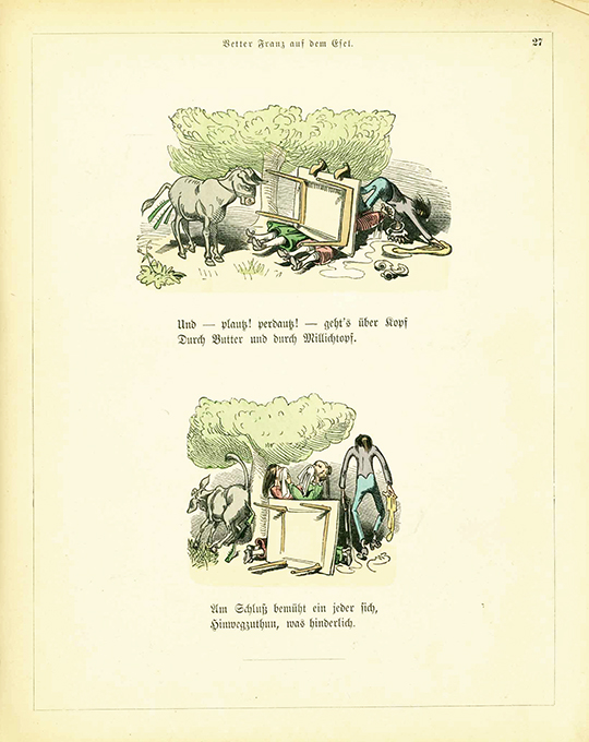 | Busch, Wilhelm, Schnaken & Schnurren. Eine Sammlung humoristischer kleiner Erzählungen in Bildern. III. Teil. München, Braun & Schneider (um 1890). 9. Aufl. 4°. illustr. Titelbl., 31 Tafeln, farb. illustr. OHlwd. (stellenw. nachgedunkelt, angestaubt, Überzugspapier teils abgewetzt, Ecken bestoßen, Vorderdeckel etw. gelockert, Rückdeckel fleckig). Papier nur vereinzelt minim. fingerfleckig u. teils mit kl. Randfehlstellen bzw. -läsuren. Insges. noch wohlerhaltenes Exemplar der recht frühen Ausgabe. * Die 103 Holzschnitte (Zinkotypien), Titelzeichnung u. Einbandillustrationen noch handkoloriert.