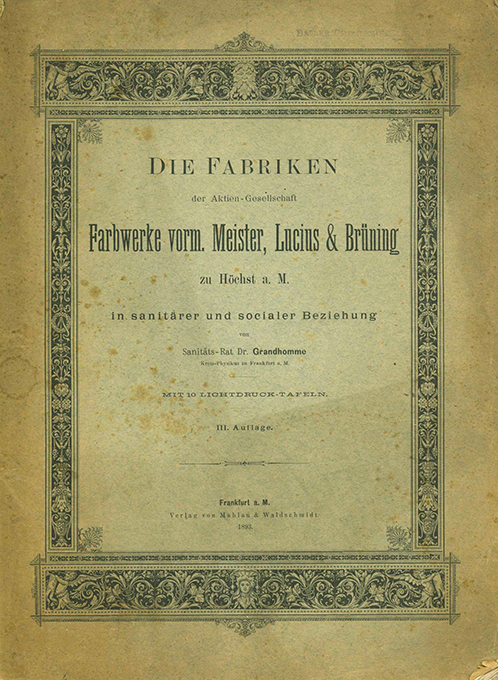 | Firmengeschichte – Grandhomme, Dr., Die Fabriken der Aktien-Gesellschaft Farbwerke vorm. Meister, Lucius & Brüning zu Höchst a.M. in sanitärer und socialer Beziehung. III. Auflage. Frankfurt, Mahlau & Waldschmidt 1893. Gr.-4°. (6), 87 S. + 10 doppelblattgr. Lichtdrucktafeln, OBrosch. (diese stark nachgedunkelt, fleckig u. mit stärkeren Beschädigungen, Bindung gelockert). Durchgehend leichte Knickspur, mehrere alte Stempel der Basler Chemischen Fabrik Bindschedler, sonst innen gut u. frisch erhalten. Selten. * Die zehn Tafeln zeigen Fabrikgebäude u. Grundrisse, Beamtenwohnhäuser, Arbeiterwohnhäuser, Aufriss der Badeanstalt, Bier- u. Speisehalle.