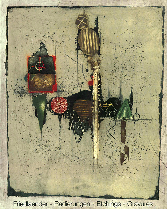 | Friedlaender, Johnny – Salzmann, Siegfried (Einführung), Friedlaender. Radierungen 1949 – 1989. Eine Auswahl. Text deutsch, englisch u. französisch. Zweite veränderte Auflage. Krefeld, Galerie Peerlings 1990. (168 S., überwieg. einseitig bedruckt) mit 76 ganzseit. farb. Abbildungen auf kräftigem Papier, OLwd. mit farb. illustr. OUmschl. Tadelloses Exemplar im Schuber. * Eins von 50 (ges. 2000) Exemplaren einer im Buch nicht genannten Vorzugsausgabe mit einer schönen, lose beiliegenden Orig.-Farbradierung mit einer kl. Blindprägung. Auf Bütten gedruckt, römisch nummeriert u. von Friedlaender signiert (ein 12 mm langer Randeinriss; kann bei Rahmung unter Passepartout gut verborgen werden). Nur die Vorzugsausgaben wurden mit einem Schuber ausgeliefert.