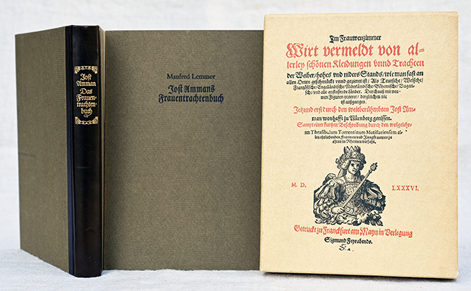 Amman, Jost, Im Frauwenzimmer Wirt vermeldt von allerley schönen Kleidungen unnd Trachten der Weiber / hohes und niders Stands / wie man fast an allen Orten geschmückt unnd gezieret ist… Faksimile der Originalausgabe Frankfurt 1586. Leipzig, Insel 1971. 124 (meist einseit.) bedr. Bl., OHalblederbd. mit goldgepr. Rückentitel. Mit dem Begleitheft von Manfred Lemmer: Jost Ammans Frauentrachtenbuch. 30, (2) S., OBüttenumschl. Tadelloses Exemplar im Schuber. 1. Auflage. * Sehr schöner Druck in kleiner Auflage mit 122 aufwändig handkolorierten, entzückenden Illustrationen. – Dargestellt wird in diesem berühmten Frauentrachtenbuch die „Damenmode“ aller Stände der damaligen Zentren Europas, von der Kaiserin bis zur Kurtisane, ergänzt durch Verse, deren liebenswerte Naivität und vielfach recht derber Humor zum Schmunzeln anregen. – Eines meiner Lieblingsbücher, das man heutzutage natürlich niemals mehr zu diesem Preis herstellen könnte – wie ja die meisten bibliophilen Werke aus einer Zeit, da sich niedrige Löhne und Liebe für’s Handwerk gepaart haben.