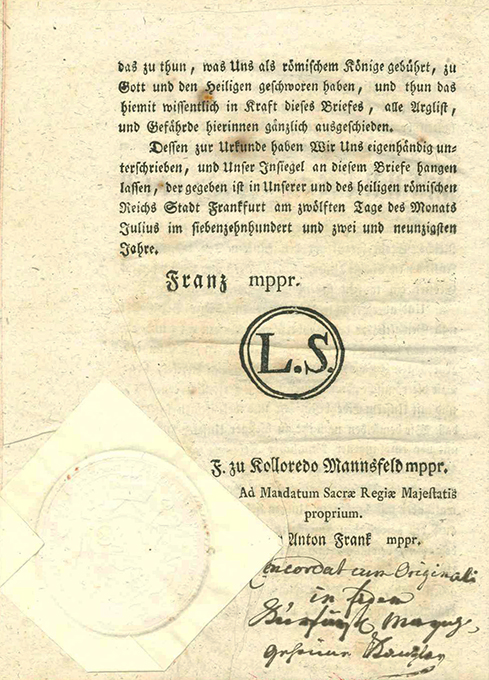 | Franz II. – Wahlkaputulation des römischen Kaisers Franz des Zweien nach dem kurmainzischen Originale zum Drucke befördert. Mit kaiserl. allerhöchstem Privilegium. Mainz, Johann Wirth 1792. (4), 120, (4) S., unbedruckter Pappbd. der Zeit (stellenw. verblasst). Vorsätze nachgedunkelt. Zwei Seiten mit kl. handschr. Korrekturen aus der Zeit. Insges. sehr gutes, frisches Exemplar und äußerst selten. EA. * Das letzte Bl. mit montierter blindgepr. Prägung des Mainzer Bischofswappens (durch das gesamte Exemplar durchgedrückt) u. handschriftl. Echtheitsbestätigung „Concordat am Originali in fedem, Kurfürste Maynz…“ – Franz Joseph Karl war von 1792 – 1806 der letzte Kaiser des Heiligen Römischen Reiches. Die Krönung fand am 14. Juli 1792 im Frankfurter Dom statt und war die letzte Kaiserkrönung in Mitteleuropa überhaupt. – Beiliegt ein ganzseit. Zeitungsartikel zur Kaiserkrönung aus der FAZ, 8. Juli 1967.