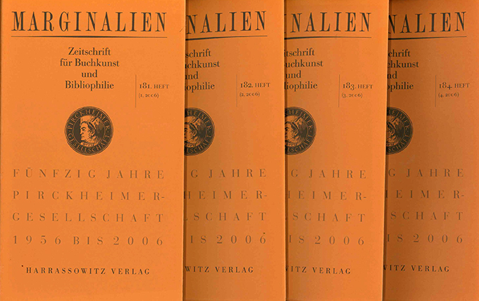 | Marginalien. Hefte 1 – 4 / 2006 (Nrn. 181 – 184, davon 2 Vorzugsausgaben). Zeitschrift für Buchkunst und Bibliophilie. Hrsg. von der Pirckheimer-Gesellschaft. Wiesbaden, Harrassowitz 2006. Gr.-8°. Zus. 456 S. mit Abbildungen + 32 S. typograph. Beilagen (Buchdruck auf Maschinenbütten), OBroschuren mit OUmschlägen. Tadellos. * Mit 2 Graphikbeilagen: Harald Kretzschmar, Ätzradierung „Brechts Todsager“. – Grit Anton, zweifarb. Holzschnitt zu Ernst Jandl, „Liegen bei dir“. Beide Graphiken auf Bütten gedruckt, signiert u. datiert. Von den Heften 1 u. 2 sind keine Vorzugsausgaben erschienen. – Aus dem Inhalt: Gertrude Degenhardt; E.T.A. Hoffmann; Jean Paul, dazu 8 S. typograph. Beilage; Werner Klemke; Oswald Brüll -Textilfabrikant u. Thomas Mann-Verehrer; Brecht (2 Beitr.); Novalis, Alle geistige Berührung gleicht der Berührung eines Zauberstabes (typograph. Beilage)