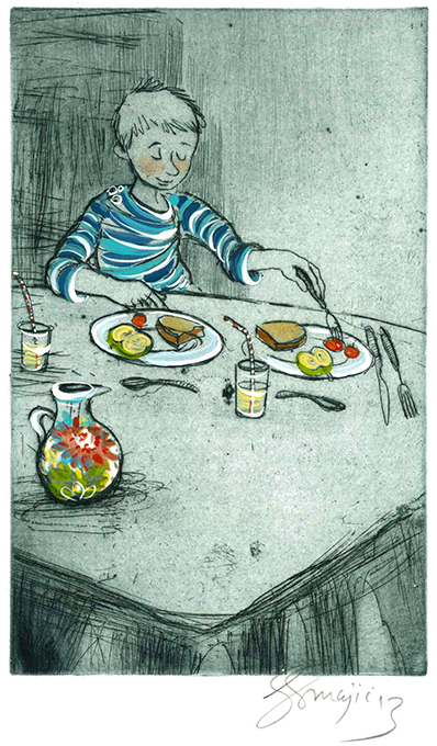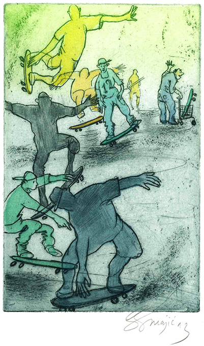 Ascona Presse – Rühmann, Karl, Knigge literarisch. Mit 5 Orig.-Farbradierungen von Susanne Smajic. Weggis 2013. 4°. (26 S.) Text, 5 Graphikbl., OHLdr. Tadelloses Exemplar im Leinenschuber mit Lederkapitalen. 1. Auflage. * 21. Druck der Ascona Presse. Eins von 20 (ges. 25) nummer. Exemplaren der Normalausgabe, außerdem sind 5 Vorzugs- u. 5 Mitarbeiterexemplare erschienen. Im Druckvermerk von der Künstlerin u. dem Autor signiert. – Die fünf Radierungen wurden von Susanne Smajic übermalt, eine durch aufgeklebte Illustrationselemente zu einer Collage erweitert u. sämtlich signiert. Auf den Vorderdeckel eingelassen eine farbige Orig.-Tuschezeichnung (9,5 x 5,1 cm) der Künstlerin. Somit ist jedes Exemplar ein Unikat. – Die Texte wurden aus der Didot-Antiqua gesetzt u. auf kräftiges Bütten gedruckt. Handeinband von Roland Meuter: Halblederband mit aufgesetzten Deckeln, goldgepr. Rückentitel u. gepunztem Kopfgoldschnitt. – „Die vorliegende Sammlung von Kurzgeschichten sind nicht bloß ein Versuch, Knigges Regeln für den Umgang mit Menschen neu zu interpretieren (…) Vielmehr geht es darum, in literarisch aufgearbeiteten Situationen aus unserem Alltag das Zeitlose zu suchen…“ (aus dem Vorwort von Jadranka Knezevic u. Karl Rühmann)