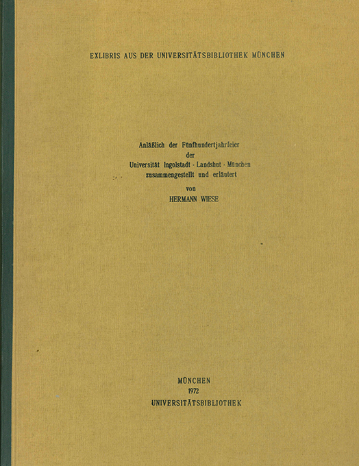 | Exlibris – Wiese, Hermann, Exlibris aus der Universitätsbibliothek München. Anläßlich der Fünfhundertjahrfeier der Universität Ingolstadt-Landshut-München zusammengestellt u. erläutert. München, Universitätsbibliothek 1972. Gr.-8°. 120 S. mit 91 Abbildungen, OKt. (minim. Knickspuren). Sonst tadellos. EA.