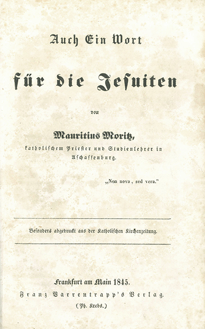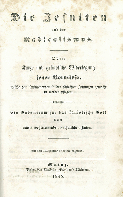 | Jesuiten – Hurter, Friedrich, Die Jesuiten. Sonderdruck aus „Geburt und Wiedergeburt“. [Dazu zwei beigebundene Werke]. Schaffhausen, Hurter 1845. 153 S., Pappbd. der Zeit (stärker berieben u. bestoßen, Läsuren). Papier vereinzelt etw. (stock)fleckig, Vorsatz mit 2 handschr. Nrn. u. Inhaltsverzeichnis von alter Hand, Titelbl. mit einem alten Stempel. Innen insges. wohlerhalten. Selten, die Beibindungen sehr selten. * Beigebunden: I. Die Jesuiten und der Radicalismus. Oder: Kurze und gründliche Widerlegung jener Vorwürfe, welche dem Jesuitenorden in den schlechten Zeitungen gemacht zu werden pflegen. Ein Vademecum für das katholische Volk von einem wohlmeinenden katholischen Laien. Mainz, Kirchheim, Schott u. Thielmann 1845. VIII, 48 S. II. Maruitius Moritz, Auch Ein Wort für die Jesuiten. Frankfurt, Barrentrapp 1845. 28 S.