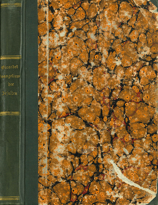 | Jesuiten – Girardet, Friedrich, Das Evangelium der Jesuiten, aus der Theorie und Praxis dieser Väter zusammengestellt und der lieben Christenheit neuerdings zur Beherzigung vorgelegt. Zweite Auflage. Leipzig, Hartknoch 1829. (6), 223 S. (die letzten 2 S. falsch paginiert), HLwd. der Zeit mit goldgepr. Rücken u. marmor. Überzugspapier (dieses berieben). Vorsatz mit div. handschr. Nummern, Titelbl. mit einem alten Monogrammstempel. Gutes Exemplar.