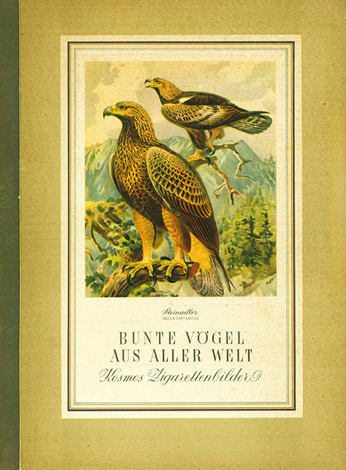 | Vögel – Kosmos Zigarettenbilder: Bunte Vögel aus aller Welt. Teil I. Memmingen, Zigarettenbilder Zentrale (um 1940). Gr.-4°. (60 S.) mit 150 mont. sehr schönen farbigen Vogelzeichnungen, farb. illustr. OKt. (stellenw. nachgedunkelt, etw. berieben, 2 Eselsohren). Sonst gut erhalten u. vollständig. EA.