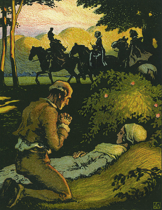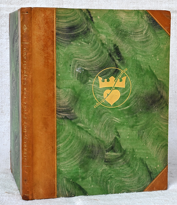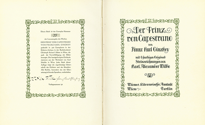 | Wilke – Ginzkey, Franz Karl, Der Prinz von Capestrano. Mit 6 farbigen Original-Steinzeichnungen von Karl Alexander Wilke. Wien u. Berlin, Wiener Literar. Anstalt (1921). 79 S. mit Bildinitiale, Schlussvignette u. grün gedruckten Schmuckrahmen auf allen Seiten, 6 montierte Farbtafeln (Bildgr. 11,5 x 14,8 cm), OHalblederbd. mit Lederecken, Kleister-Überzugspapier u. -Vorsätzen, Goldpr. u. Kopfgoldschnitt (etw. berieben u. bestoßen, 2 kl. Einrisse an den Gelenken). Die ersten Bl. an einer Ecke minim. angeknickt. Innendeckel mit hübschem Exlibris (Orig.-Radierung). Insgesamt recht gutes Exemplar. EA WG² 22. * Eins von 300 handschr. nummer. Exemplaren der Vorzugsausgabe, im Druckvermerk von Ginzkey u. Wilke signiert. – Satz des Textes aus der Behrens-Antiqua. Das Buch wurde in der Werkstatt von Karl Scheibe in Wien von Hand gebunden.