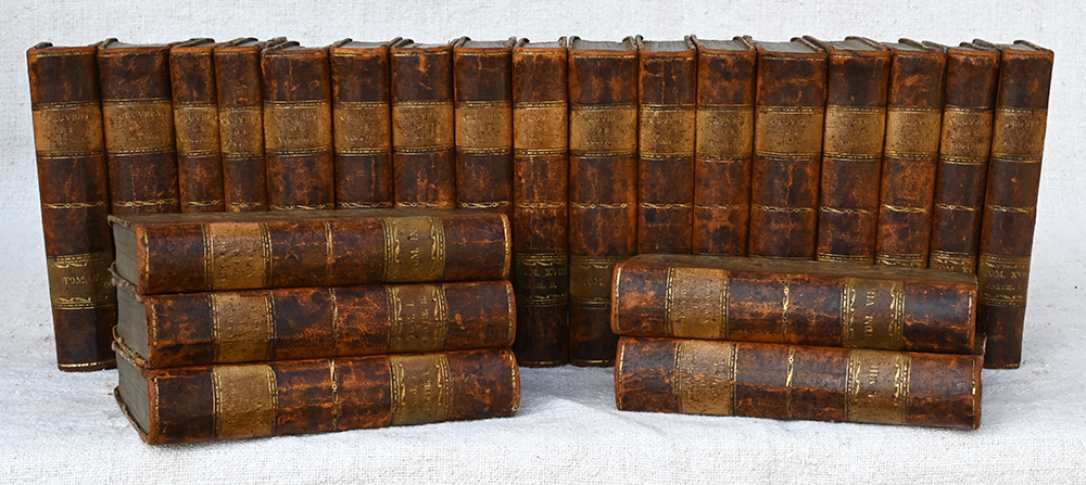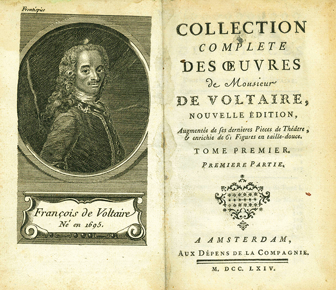 Voltaire, Collection complete des oeuvres. Nouvelle édition. Augmentée de ses dernieres Pieces de Théâtre, & enrichie de 61 [recte: 59] Figures en taille-douce. 18 Bände in 22 Bänden. Amsterdam (Rouen?) Dépens de la Compagnie (Machuel?) 1764. Kl.-8°. 22 Titelbl., zus. 8892 S. mit zahlr. Holzschnitt-Initialen, -Zierleisten u. -Zierstücken + 59 (3 gefalt.) Kupferstichtafeln, Einheitlich gebundene Halblederbde. der Zeit mit jeweils 2 goldgepr. Lederrückenschildchen (stellenw. berieben, Leder mit feinen Haarrissen, wenige Gelenke geringfügig eingerissen, wenige Läsuren). Vorsätze jeweils mit Namenszug von alter Hand, ein Innendeckel mit 3 eingeklebten holländischen Briefmarken. Papier an den Rändern nur gering nachgedunkelt u. vereinzelt leicht fleckig. Nur wenige Bl. mit kl. Eckabrissen, teils mit geringem Textverlust. Insges. gutes u. frisches Exemplar. Es fehlen lediglich 2 Stiche zu „La Henriade“ (diese waren nie eingebunden), ansonsten vollständig. Erste Auflage dieser um mehrere Theaterstücke erweiterten Ausgabe. Nicht bei Sander, jedoch in der Bibliographie der Gesammelten Werke auf Wikipedia. * Die Kupferstiche überwiegend zu Theaterstücken, mehrere Portraits (Molière, Rousseau, Voltaire u.a.), 17 Stiche zu „Physique Newtonienne“ u. weiteren Abhandlungen zur Physik, 2 gefalt. Tafeln „Bataille de Fontenoy le n. May 1745“ u. 1 gefalt. Tafel „Plan de la Bataille de Laveld“.