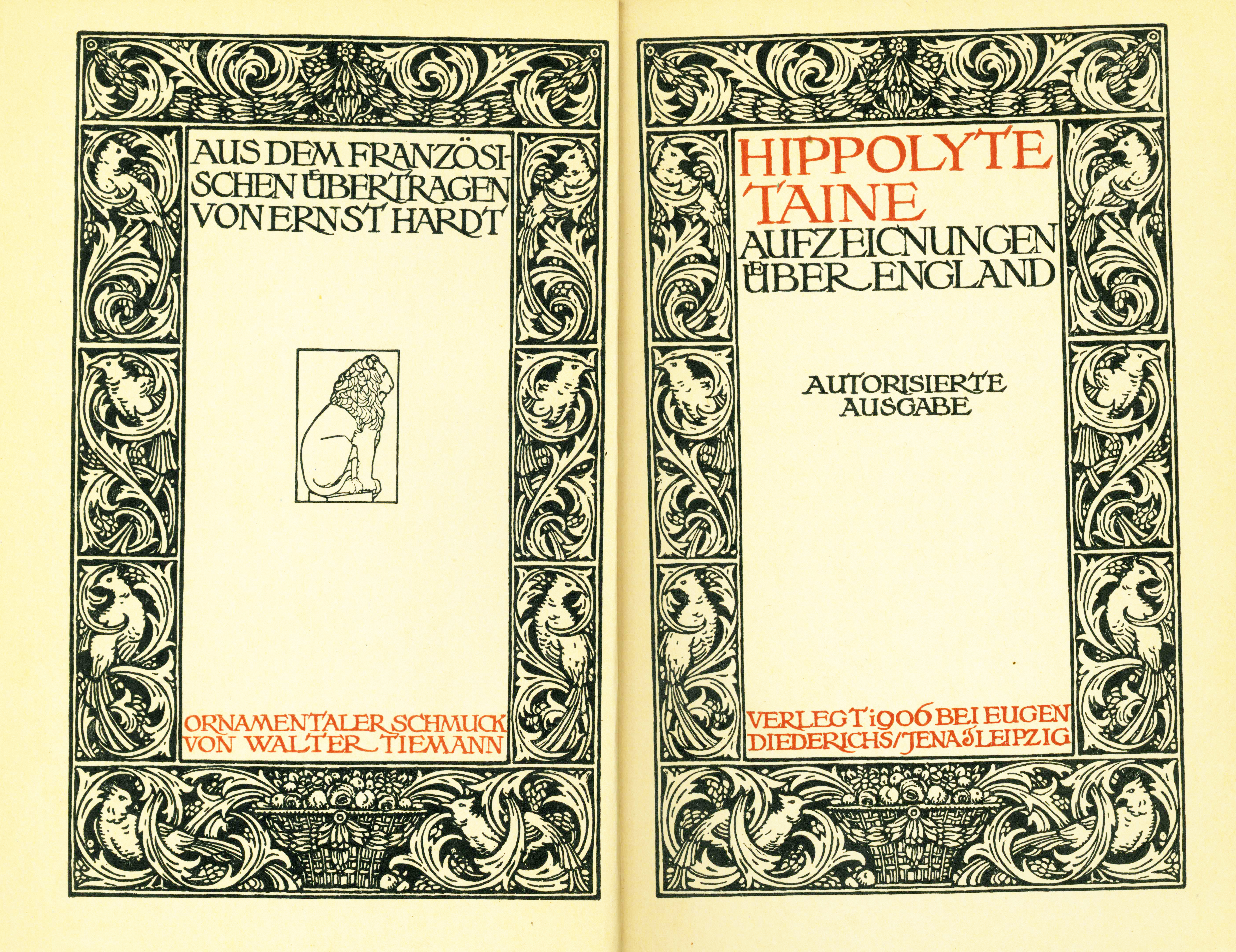 | Taine, Hippolyte, Aufzeichnungen über England. Übertr. von Ernst Hardt. Jena, Diederichs 1906. Doppeltitel, 328, (4) S., weinroter flexibler OLwd. mit Goldpr. u. Kopfgoldschnitt. Schönes Exemplar. DEA. * Doppeltitel, Zierleisten, Schmuckinitialen u. Einbandgestaltung von Walter Tiemann.