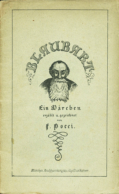 Pocci, F(ranz) – Blaubart. Ein Märchen, erzählt u. gezeichnet von F. Pocci. München, Buchhandlung Christian Kaiser (1846; 2. Aufl.) 16 S. mit 16 Zeichnungen, OBrosch. mit 2 weit. Zeichnungen auf Vorder- u. Rückdeckel (stellenw. nachgedunkelt, Rückenfalz stellenw. eingerissen). Das Textpapier nur minim. nachgedunkelt. Insges. gutes u. frisches Exemplar. * Titelauflage der 1845 in München bei Zach erschienenen, praktisch unauffindbaren Erstausgabe. Poccis schöne Illustrationen zu seinem in Versen geschriebenen Märchen wurden als Lithographien gedruckt.