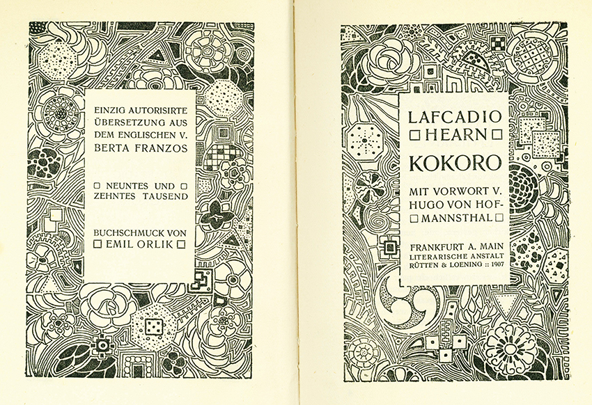 | Orlik – Hearn, Lafcadio, Kokoro. Übertr. von Berta Franzos. Vorwort von Hugo von Hofmannsthal. Buchschmuck (Doppeltitel, Zierleisten, Vignetten, Schmuckrahmen, illustr. Vorsätze) von Emil Orlik. Frankfurt, Rütten & Loening 1907. 9.-10. Tsd. 290 S., flexibler OGanzpergamentbd. mit dekoriertem Vorderdeckel u. Rücken, Goldpr. u. Kopfgoldschnitt (das Pergament am Kopfkapital mit 23 x 15 mm großer Fehlstelle). Sonst gutes Exemplar.