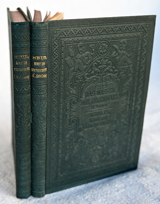 | Kunstgeschichte – Schultz, Alwin, Kunst und Kunstgeschichte. Eine Einführung in das Studium der neueren Kunstgeschichte. (= Das Wissen der Gegenwart. Deutsche Universal-Bibliothek für Gebildete, Bde. XVIII u. XXI). Zwei Bände. Leipzig, Freytag u. Prag, Tempsky 1884. (6), 276 u. (8), 244 S. mit insges. 86 Vollbildern u. 162 in den Text gedruckten Holzschnitten, blindgepr. OLwdbde. mit goldgepr. Rückentiteln u. Ganzfarbschnitten (ein Rückentitel minim. berieben). Papier wie immer materialbed. etw. nachgedunkelt, Innendeckel jeweils mit Namenszug, kl. herald. Stempel u. Exlibris von Fr. Bechtoldsheim. Insges. sehr gut erhaltene Bände. EA. * I. Architektur und Plastik. II. Malerei und vervielfältigende Künste.