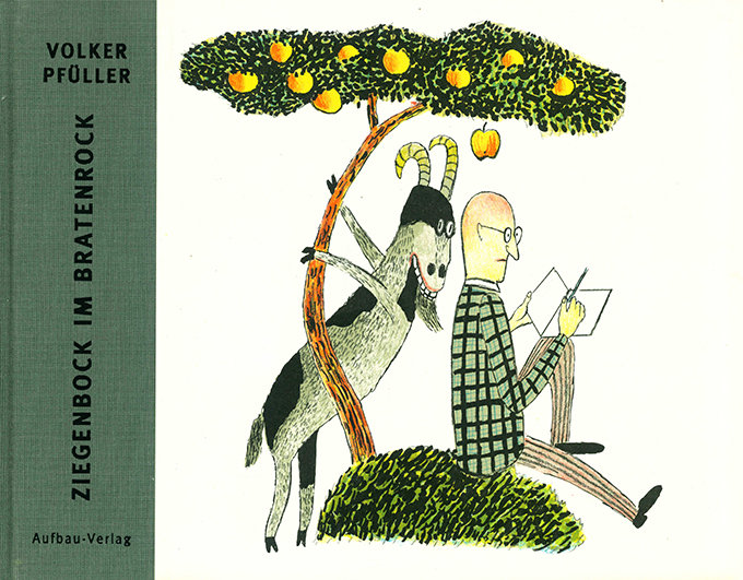 | Pfüller, Volker, Ziegenbock im Bratenrock. 15 Verse mit Bildern von V.P. Hrsg. von Ute Blaich. Berlin, Aufbau-Verlag 2000. 27,5 x 21,5 cm (quer). (32 S.), farb. illustr. OHlwd. Sehr gutes Exemplar. EA. * Bei den 17 (einschl. Einband) Farbillustrationen handelt es sich um fünffarbige Orig.-Offsetlithographien, gedruckt auf Rives Traditionspapier.