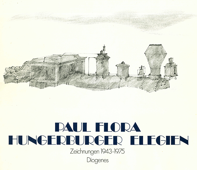 | Flora, Paul, Hungerburger Elegien. Zeichnungen 1943 – 1974. Mit einem Vorwort des Künstlers. (= 44. Werk im ‚Club der Bibliomanen‘). Zürich, Diogenes 1975. 35 x 30,5 cm (quer). 61, (3) S., OLwd. mit Lederrsch. u. illustr. OUmschl. (dieser am Rücken etw. nachgedunkelt). Eine Ecke durchgehend etw. angeknickt. Insges. jedoch noch gutes Exemplar in (etw. unfrischem) Schuber. EA (nicht bei Tiessen). * Dieses Exemplar auf dem Vortitelbl. von Flora signiert.